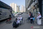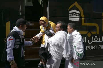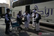 Petugas Penyelenggara Ibadah Haji (PPIH) Daker Makkah membantu jamaah calon haji (JCH) Indonesia gelombang pertama SUB 45 saat tiba dari Madinah di Makkah, Arab Saudi, Sabtu (1/6/2024). Sebanyak 12 kloter terakhir jamaah calon haji gelombang pertama yang berjumlah 4.743 orang dari Madinah telah tiba di Makkah. ANTARA FOTO/Sigid Kurniawan/nym.