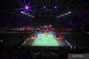 Suasana babak semifinal Indonesia Open 2024 saat pebulu tangkis ganda putra Indonesia Sabar Karyaman Gutama dan M Reza Pahlevi Isfahani melawan ganda putra Malaysia Man Wei Chong dan Kai Wun Tee di Istora Senayan, Jakarta, Sabtu (8/6/2024). Sabar/Reza gagal melaju ke babak final setelah kalah dalam dua gim dengan skor 27-29 dan 13-21. ANTARA FOTO/Aprillio Akbar/aww.