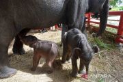 Dua bayi gajah bersama induknya di Phaniad Luang Elephant Village di Provinsi Ayutthaya, Thailand, Senin (10//6/2024). Pangjamjuri, seekor gajah betina berusia 36 tahun, melahirkan gajah kembar berjenis kelamin jantan dan betina di Provinsi Ayutthaya, Thailand, pada Jumat (7/6) malam waktu setempat. ANTAR FOTO/Xinhua/Rachen Sageamsak/rwa.