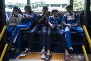 Pelajar SMP Negeri 4 Jakarta berada di dalam bus sekolah gratis di Jalan Perwira, Sawah Besar, Jakarta, Jumat (14/6/2024). Pemprov DKI Jakarta mengoperasikan sekitar 220 unit bus sekolah gratis bagi para pelajar dengan 41 rute yang tersebar di lima wilayah DKI Jakarta. ANTARA FOTO/Aprillio Akbar/YU