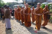 Sejumlah biksu mengikuti kirab Gebyar Waisak 2568 BE/ 2024 di Krecek, Getas, Kaloran, Temanggung, Jateng, Minggu (16/6/2024). Gebyar Waisak 2024 mengusung tema Memperkokoh Persatuan dalam Keberagaman itu dihadiri ribuan umat Buddha dari berbagai daerah yang diisi dengan sejumlah kegiatan seperti pentas seni dan kegiatan keagamaan. ANTARA FOTO/Anis Efizudin/Spt.