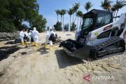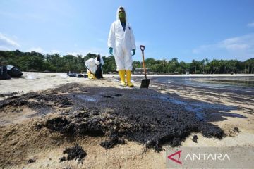 Sejumlah pekerja membersihkan tepi pantai dari tumpahan minyak di Pantai Tanjong, Pulau Sentosa, Singapura, Minggu (16/6/2024). Tumpahan minyak tersebut akibat tabrakan antara sebuah kapal keruk berbendera Belanda dengan kapal bunker berbendera Singapura di Terminal Pasir Panjang di dekat Sentosa pada Jumat (14/6) yang menyebabkan terjadinya kebocoran minyak dan mencemari perairan sekitarnya. ANTARA FOTO/Xinhua/Then Chih Wey/tom.