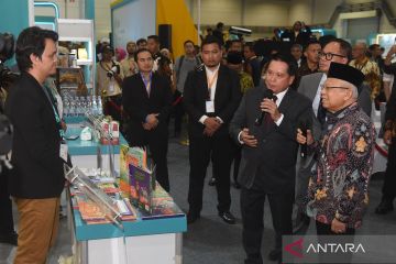 Wakil Presiden Ma'ruf Amin (kanan) didampingi Direktur Utama BSI Hery Gunardi (ketiga kanan), dan Wakil Menteri BUMN Kartiko Wiroatmodjo (kedua kanan) mengunjungi tenant pelaku usaha saat pembukaan BSI International Expo 2024 di Jakarta Convention Center, Jakarta, Kamis (20/6/2024). BSI International Expo 2024 yang berlangsung 20-23 Juni 2023 itu diikuti 270 tenant dari dalam dan luar negeri untuk mengenalkan pelaku usaha halal ke dalam industri global dengan menargetkan jumlah transaksi mencapai Rp1 triliun. ANTARA FOTO/Indrianto Eko Suwarso/wpa.