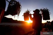 Masyarakat Suku Tengger membawa hasil bumi saat Yadnya Kasada di kawah Gunung Bromo, Probolinggo, Jawa Timur, Sabtu (22/6/2024). Perayaan Yadnya Kasada merupakan bentuk ungkapan syukur dan penghormatan kepada leluhur masyarakat Suku Tengger dengan cara melarung sesaji berupa hasil bumi dan ternak ke kawah Gunung Bromo. ANTARA FOTO/Muhammad Mada/aww.