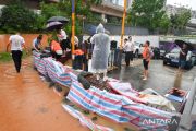 Relawan meletakkan karung pasir pengendali banjir di pintu masuk sebuah garasi bawah tanah di Changsha, Provinsi Hunan, China Tengah, Senin (24/6/2024). Hujan deras yang mengguyur Changsha menyebabkan sedikitnya 15 ruas jalan terendam air, dan kota tersebut telah mengaktifkan tanggap darurat Level III untuk banjir. ANTARA FOTO/Xinhua/Chen Zeguo/Spt.