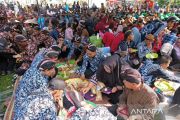 Warga menyantap makanan bersama saat tradisi selamatan pada Festival Petik Kopi di kawasan perkebunan kopi Desa Kalibanger, Gemawang, Temanggung, Jawa Tengah, Rabu (26/6/2024). Festival yang dihadiri ribuan warga tersebut sebagai ajang silaturahmi petani kopi serta selamatan dalam memulai panen kopi sekaligus sarana mempromosikan kopi robusta Gemawang ke pasar yang lebih luas. ANTARA FOTO/Anis Efizudin/tom.