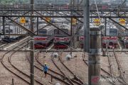 Petugas berjalan di dekat sejumlah rangkaian kereta rel listrik (KRL) di Dipo KRL Depok, Jawa Barat, Jumat (5/7/2024). PT Kereta Api Indonesia (Persero) akan menambah impor KRL baru dari China sebanyak 8 rangkaian kereta atau trainset senilai Rp2,20 triliun untuk memenuhi kebutuhan armada KRL Jabodetabek pada tahun 2025. ANTARA FOTO/Yulius Satria Wijaya/YU