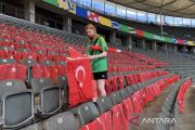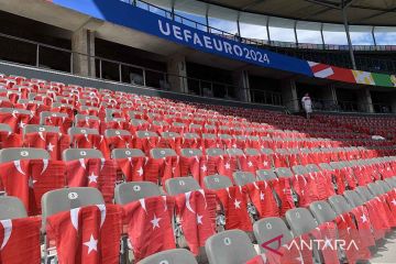 Atribut bendera Turki terpasang di kursi-kursi penonton jelang laga perempatfinal Piala Eropa 2024 antara Belanda melawan Turki di Olympiastadion, Berlin, Jerman, Sabtu (6/7/2024). ANTARA FOTO/Citra Listya Rini/rwa.