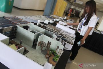 Pengunjung melihat karya desain interior yang dipajang dalam pameran bertajuk Design Designer Designest di Gedung Malang Creative Centre, Jawa Timur, Rabu (10/7/2024). Pameran yang berlangsung selama tiga hari tersebut menampilkan berbagai karya seperti desain interior, desain buku, poster, dan fotografi dari mahasiswa Universitas Bina Nusantara. ANTARA FOTO/Ari Bowo Sucipto/aww.