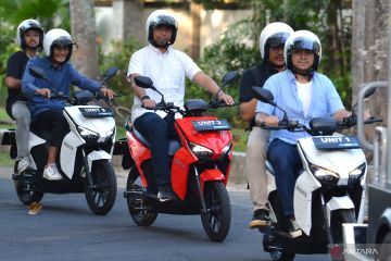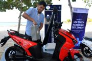 Petugas berkeliling kawasan wisata dengan mengendarai sepeda motor listrik di The Nusa Dua, Badung, Bali, Jumat (12/7/2024). InJourney Tourism Development Corporation (ITDC) bersama Indonesia Battery Corporation (IBC) memulai kolaborasi proyek percontohan penggunaan kendaraan operasional bertenaga listrik dan menempatkan battery swapping station di kawasan wisata itu guna mendukung implementasi ekosistem pariwisata hijau dan berkelanjutan. ANTARA FOTO/Fikri Yusuf/aww.