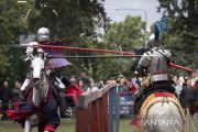 Para kontestan dengan mengenakan baju zirah berat bertanding dalam Turnamen Kastel Turku 2024 di Turku, Finlandia, Minggu (14/7/2024). Turnamen Turku Castle Tournament tersebut berlangsung selama empat hari. ANTARA FOTO/Xinhua/Matti Matikainen/rwa.