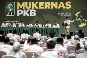 Ketua Umum Partai Kebangkitan Bangsa (PKB) Muhaimin Iskandar menyampaikan pidato politiknya dalam pembukaan Musyawarah Kerja Nasional (Mukernas) PKB di JCC Senayan, Jakarta, Selasa (23/7/2024). Mukernas tersebut mengangkat tema Menang Pilkada Menangkan Rakyat. ANTARA FOTO/Aprillio Akbar/Spt.