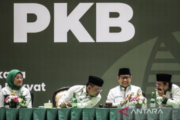 Ketua Umum Partai Kebangkitan Bangsa (PKB) Muhaimin Iskandar (kedua kanan) berbincang dengan Wakil Ketua Umum PKB bidang Ideologi dan Kaderisasi Hanif Dhakiri (kedua kiri) dan Sekjen PKB M Hasanuddin Wahid (kanan) disaksikan Wakil Ketua Umum PKB bidang Kesra dan Perekonomian Ida Fauziyah (kiri) dalam pembukaan Musyawarah Kerja Nasional (Mukernas) PKB di JCC Senayan, Jakarta, Selasa (23/7/2024). Mukernas tersebut mengangkat tema Menang Pilkada Menangkan Rakyat. ANTARA FOTO/Aprillio Akbar/Spt.