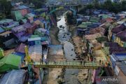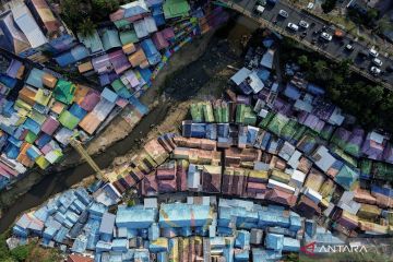Foto udara kondisi Kampung Warna-Warni Jodipan (KWJ) di Malang, Jawa Timur, Jumat (26/7/2024). Pemerintah Kota setempat mengupayakan peremajaan tiga kampung tematik yakni Kampung Tridi, Kampung Warna-warni Jodipan (KWJ) dan Kampung Biru Arema menggunakan dana program tanggung jawab sosial perusahaan (CSR) dengan harapan dapat meningkat kunjungan wisata di wilayah tersebut. ANTARA FOTO/Irfan Sumanjaya/aww.