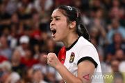 Pebulu tangkis tunggal putri Indonesia Gregoria Mariska Tunjung menyapa penonton usai mengalahkan pebulu tangkis Republik Ceko Tereza Svabikova pada babak penyisihan grup G Olimpiade Paris 2024 di Porte De La Chapella Arena, Paris, Prancis, Rabu (31/7/2024). Gregoria menang dengan dua gim langsung 21-12, 21-18. ANTARA FOTO/Wahyu Putro A/Spt.
