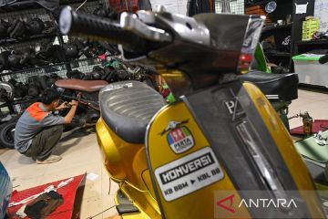 Teknisi mengonversi sepeda motor berbahan bakar minyak menjadi sepeda motor listrik di Bengkel Elders Garage, Pancoran, Jakarta, Jumat (2/8/2024). Kementerian ESDM membuka layanan gratis bagi 500 sepeda motor BBM milik warga bertempat tinggal di Jabodetabek untuk dikonversi menjadi sepeda motor listrik dengan biaya Rp16 juta per unit, tidak termasuk biaya cek fisik, biaya perubahan surat kendaraan, dan biaya rekondisi kendaraan. ANTARA FOTO/Aditya Pradana Putra/tom.