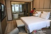 Pekerja menata tempat tidur di salah satu kamar Swissotel Nusantara, IKN, Penajam Paser Utara, Kalimantan Timur, Jumat (2/8/2024). Swissotel Nusantara yang merupakan hotel bintang lima di IKN itu telah beroperasi dan siap menampung tamu pada upacara HUT Ke-79 Kemerdekaan RI di IKN. ANTARA FOTO/Hafidz Mubarak A/tom.