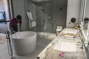Pekerja merapikan bagian kamar mandi di salah satu kamar Swissotel Nusantara, IKN, Penajam Paser Utara, Kalimantan Timur, Jumat (2/8/2024). Swissotel Nusantara yang merupakan hotel bintang lima di IKN itu telah beroperasi dan siap menampung tamu pada upacara HUT Ke-79 Kemerdekaan RI di IKN. ANTARA FOTO/Hafidz Mubarak A/tom.
