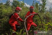 Anggota Polri dan petugas Manggala Agni berupaya memadamkan kebakaran lahan gambut di Kelurahan Kalampangan, Palangka Raya, Kalimantan Tengah, Minggu (4/8/2024). Berdasarkan data dari Badan Penanggulangan Bencana dan Pemadam Kebakaran (BPBPK) Provinsi Kalimantan Tengah, luas lahan yang terbakar dari 1 Januari hingga 3 Agustus 2024 seluas 384,85 hektare dari 193 kejadian karhutla. ANTARA FOTO/Auliya Rahman/Spt.