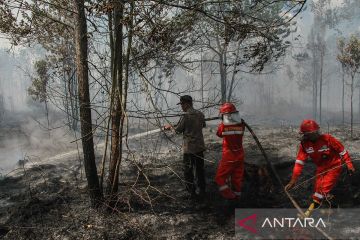 Sejumlah relawan pemadam kebakaran berupaya memadamkan sisa api yang membakar lahan gambut di Kelurahan Kalampangan, Palangka Raya, Kalimantan Tengah, Minggu (4/8/2024). Berdasarkan data Badan Penanggulangan Bencana dan Pemadam Kebakaran (BPBPK) Provinsi Kalimantan Tengah, luas lahan yang terbakar dari 1 Januari hingga 3 Agustus 2024 seluas 384,85 hektare dari 193 kejadian karhutla. ANTARA FOTO/Auliya Rahman/Spt.
