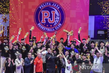 Tim bola basket Pelita Jaya Jakarta mengangkat trofi juara Indonesia Basketball League (IBL) 2024 setelah menang atas Satria Muda Pertamina pada pertandingan ketiga final IBL 2024 di Indoor Stadium Sport Centre, Kabupaten Tangerang, Banten, Minggu (4/8/2024). Pelita Jaya Jakarta berhasil meraih gelar juara usai mengalahkan Satria Muda Pertamina dengan skor 73-65. ANTARA FOTO/Sulthony Hasanuddin/Spt.