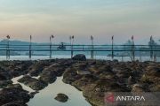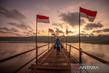 Warga berjalan di antara bendera Merah Putih di Jembatan Sesek Pajangan, Bantul, D.I Yogyakarta, Senin (5/8/2024). Jembatan bambu tersebut dihiasi ratusan bendera Merah Putih guna menyambut HUT Ke-79 Kemerdekaan Republik Indonesia. ANTARA FOTO/Andreas Fitri Atmoko/rwa.