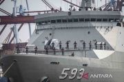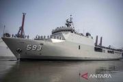 KRI Banda Aceh-593 bertolak menuju Balikpapan di Dermaga Jakarta International Container Terminal (JICT) I, Tanjung Priok, Jakarta, Senin (5/8/2024). KRI Banda Aceh-593 mengangkut 171 prajurit TNI, 100 taruna dari Akademi TNI dan Akademi Kepolisian serta lebih dari 30 unit kendaraan operasional yang akan dilibatkan untuk upacara HUT ke-79 Kemerdekaan RI di Ibu Kota Nusantara (IKN). ANTARA FOTO/Aprillio Akbar/rwa.