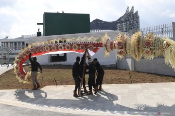 Sejumlah pekerja menyiapkan penjor di depan Istana Garuda IKN, Penajam Paser Utara, Kalimantan Timur, Jumat (16/8/2024). Menurut Presiden Joko Widodo, jumlah tamu undangan yang akan hadir dalam upacara HUT Ke-79 RI di IKN berjumlah 1.300 orang yang semula 8.000 orang. ANTARA FOTO/M Risyal Hidayat/foc.