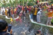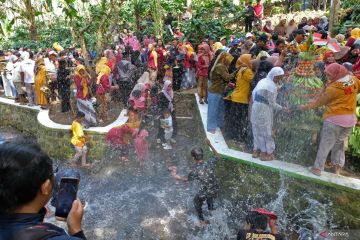 Sejumlah warga melakukan perang air saat tradisi Nyadran 1.000 Kupat di Dusun Gedongan, Ngemplak, Kandangan, Temanggung, Jawa Tengah, Jumat (16/8/2024). Tradisi Nyadran 1.000 Kupat rutin dilaksanakan untuk mengenang tokoh pendiri dusun bernama Kyai Lenging sekaligus sebagai permohonan doa serta ungkapan rasa syukur kepada Tuhan Yang Maha Esa atas kemakmuran dan kesejahteraan warga setempat. ANTARA FOTO/Anis Efizudin/foc.
