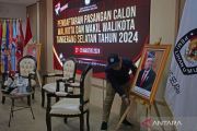 Petugas KPU Kota Tangerang Selatan merapikan foto wakil presiden yang terpampang di ruang penerimaan pendaftaran kantor KPU Kota Tangerang Selatan, Serpong, Tangerang Selatan, Banten, Selasa (27/8/2024). Hari pertama pendaftaran bakal calon walikota dan wakil walikota Tangerang Selatan dipastikan tidak ada yang mendaftar. ANTARA FOTO/Muhammad Iqbal/nym.