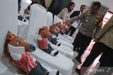 Kapolda Sultra Irjen Pol Dwi Irianto (kanan) melihat boneka maskot Pilkada Sultra saat memantau lokasi pendaftaran Pilkada serentak di Kantor KPU Sultra, Kendari, Sulawesi Tenggara, Selasa (27/8/2024). Kegiatan tersebut dalam rangka melihat kesiapan KPU setempat dalam menerima pendaftaran calon kepala daerah sekaligus memastikan kesiapan pengamanan dari TNI/Polri. ANTARA FOTO/Andry Denisah/nym.