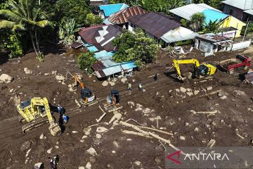 Foto udara operator alat berat memindahkan sisa material lumpur yang terbawa banjir bandang di Kelurahan Rua Kota Ternate, Maluku Utara, Selasa (27/8/2024). Kementerian PUPR melalui Balai Wilayah Sungai (BWS) Maluku Utara mengerahkan sejumlah alat berat untuk membuka akses jalan yang menghubungkan Kelurahan Rua dan Kastela agar aktivitas warga kembali normal pascabanjir bandang di daerah itu.ANTARA FOTO/Andri Saputra/rwa.
