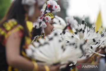 Sejumlah penari membawakan tarian khas Dayak saat mengiringi bakal calon Gubernur Kalimantan Timur Rudy Mas'ud dan bakal calon Wakil Gubernur Seno Aji memakai atribut saat mengikuti pendaftaran di KPU Provinsi Kaltim, di Samarinda, Kamis (29/8/2024). Sejumlah penampilan budaya seperti Reog Ponorogo, Kuda lumping, tarian Dayak, tarian Bugis hingga tarian Topeng Ireng mengiringi pasangan Rudy Mas'ud-Seno Aji yang mendaftarkan diri sebagai peserta Pilkada Kaltim 2024 dengan dukungan dari partai politik yang tergabung dalam Koalisi Indonesia Maju (KIM) Plus. ANTARA FOTO/M Risyal Hidayat/YU