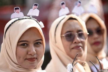Pendukung bakal calon Gubernur Kalimantan Timur Rudy Mas'ud dan bakal calon Wakil Gubernur Seno Aji memakai atribut di KPU Provinsi Kaltim, Samarinda, Kamis (29/8/2024). Pasangan Rudy Mas'ud-Seno Aji resmi mendaftarkan diri sebagai peserta Pilkada Kaltim 2024 dengan dukungan dari partai politik yang tergabung dalam Koalisi Indonesia Maju (KIM) Plus. ANTARA FOTO/M Risyal Hidayat/YU