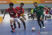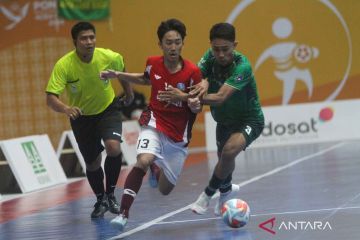 Atlet futsal Jawa Timur Diaz Firman Maulana (tengah) berusaha melewati hadangan atlet futsal NTT Mario Kidang (kanan) pada pertandingan futsal PON XXI Aceh-Sumut di Arena Futsal Dinas Pemuda dan Olahraga Sumatera Utara (Disporasu), Deli Serdang, Sumatera Utara, Kamis (29/8/2024). Tim futsal NTT berhasil mengalahkan tim futsal Jawa Timur dengan skor akhir 6-4. ANTARA FOTO/Fransisco Carolio/YU