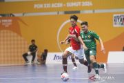 Atlet futsal NTT Alfiano Na'u Bidaya (kanan) berusaha mempertahankan bola dari atlet futsal Jawa Timur Mohammad Yuda Saiful Hidayat (kiri) pada pertandingan futsal PON XXI Aceh-Sumut di Arena Futsal Dinas Pemuda dan Olahraga Sumatera Utara (Disporasu), Deli Serdang, Sumatera Utara, Kamis (29/8/2024). Tim futsal NTT berhasil mengalahkan tim futsal Jawa Timur dengan skor akhir 6-4. ANTARA FOTO/Fransisco Carolio/YU