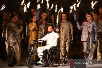 Seorang atlet membawa obor paralimpiade dalam pembukaan Paralimpiade Paris 2024 di Place de la Concorde, Paris, Prancis, Rabu (28/8/2024). Kontingen Indonesia diperkuat 35 atlet yang bertanding pada 10 cabang olahraga pada ajang olahraga terbesar sedunia yang diikuti atlet penyandang disabilitas dari berbagai negara. ANTARA FOTO/HO-NPC/Spt.