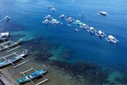 Foto aerial sejumlah wisatawan melihat Hiu Paus (Rhincodon Typus) dengan menaiki perahu di objek wisata Hiu Paus Desa Botubarani, Kabupaten Bone Bolango, Gorontalo, Sabtu (31/8/2024). Dinas Pariwisata Provinsi Gorontalo menggelar Festival Hiu Paus untuk pertama kalinya sebagai sarana promosi ekosistem pariwisata yang terintegrasi dengan kelestarian lingkungan berkelanjutan. ANTARA FOTO/Adiwinata Solihin/aww.