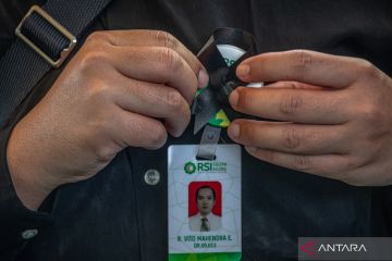 Seorang dokter mengenakan pita hitam sebagai dukungan kepada Dekan Fakultas Kedokteran (FK) Universitas Diponegoro (UNDIP) Yan Wisnu Prajoko sekaligus sebagai Dokter Spesialis Bedah dengan Subspesialis Bedah Onkologi serta dosen pendidikan dokter spesialis-subspesialis yang aktivitas klinisnya diberhentikan sementara di RSUP Kariadi Semarang, saat aksi solidaritas bertajuk Bersama Membangun Pendidikan Bermartabat di FK Kedokteran UNDIP, Tembalang, Semarang, Jawa Tengah, Senin (2/9/2024). FK Kedokteran UNDIP menentang pemberhentian aktivitas klinis dokter Yan Wisnu di RSUP Kariadi oleh Kemenkes terkait dugaan adanya kasus perundungan yang menyebabkan salah satu mahasiswi Program Pendidikan Dokter Spesialis (PPDS) Anestesi berinisial ARL (30) diduga meninggal karena bunuh diri, serta membuka diri untuk keadilan bagi semua pihak dalam kasus yang masih dalam proses investigasi oleh Kemenkes dan Polda Jateng itu. ANTARA FOTO/Aji Styawan/aww.