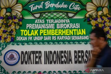 Seorang mahasiswa Fakultas Kedokteran (FK) Universitas Diponegoro (UNDIP) melintas di depan karangan bunga dukungan kepada Dekan FK UNDIP Yan Wisnu Prajoko sekaligus sebagai Dokter Spesialis Bedah dengan Subspesialis Bedah Onkologi serta dosen pendidikan dokter spesialis-subspesialis yang aktivitas klinisnya diberhentikan sementara di RSUP Kariadi Semarang, saat aksi solidaritas bertajuk Bersama Membangun Pendidikan Bermartabat di FK Kedokteran UNDIP, Tembalang, Semarang, Jawa Tengah, Senin (2/9/2024). FK Kedokteran UNDIP menentang pemberhentian aktivitas klinis dokter Yan Wisnu di RSUP Kariadi oleh Kemenkes terkait dugaan adanya kasus perundungan yang menyebabkan salah satu mahasiswi Program Pendidikan Dokter Spesialis (PPDS) Anestesi berinisial ARL (30) diduga meninggal karena bunuh diri, serta membuka diri untuk keadilan bagi semua pihak dalam kasus yang masih dalam proses investigasi oleh Kemenkes dan Polda Jateng itu. ANTARA FOTO/Aji Styawan/aww.