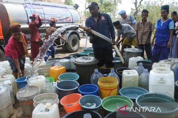 Petugas Badan Penanggulangan Bencana Daerah (BPBD) Situbondo mendistribusikan air bersih di Desa Selomukti, Mlandingan, Situbondo, Jawa Timur, Rabu (4/9/2024). BPBD Situbondo mendistribusikan air bersih ke delapan desa yang tersebar di enam kecamatan terdampak kekeringan dan kesulitan air bersih. ANTARA FOTO/Seno/Spt.