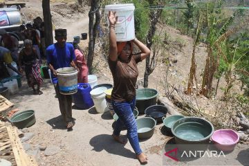 Sejumlah warga membawa wadah berisi air bersih yang didistribusikan Badan Penanggulangan Bencana Daerah (BPBD) Situbondo di Desa Selomukti, Mlandingan, Situbondo, Jawa Timur, Rabu (4/9/2024). BPBD Situbondo mendistribusikan air bersih ke delapan desa yang tersebar di enam kecamatan terdampak kekeringan dan kesulitan air bersih. ANTARA FOTO/Seno/Spt.