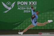 Atlet senam Sumatera Utara Rivinna Widya Rahma beraksi pada final senam aerobik perorangan putri PON XXI Aceh-Sumut di Gedung Serbaguna Dispora Sumatera Utara, Deli Serdang, Sabtu (7/9/2024). Pesenam DKI Jakarta Krischayani Kurniawan meraih medali emas dengan nilai 18,650, medali perak diraih pesenam Jawa Timur Della Rose Ananda Purbowo dengan nilai 18,450 dan medali perunggu diraih pesenam DI Yogyakarta Elmalia Virdania Putri dengan nilai 17,800. ANTARA FOTO/Makna Zaezar/YU