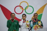 Pesenam DKI Jakarta Kriscahyani Kurniawan (tengah) bersama pesenam Jawa Timur Della Rose Ananda (kiri) dan pesenam DI Yogyakarta Elmalia Virdania Putri (kanan) menunjukkan medalinya usai upacara penganugerahan medali pada final senam aerobik perorangan putri PON XXI Aceh-Sumut di Gedung Serbaguna Dispora Sumatera Utara, Deli Serdang, Sabtu (7/9/2024). Krischayani Kurniawan meraih medali emas dengan nilai 18,650, medali perak diraih pesenam Jawa Timur Della Rose Ananda Purbowo dengan nilai 18,450 dan pesenam DI Yogyakarta Elmalia Virdania Putri mendapatkan medali perunggu dengan nilai 17,800. ANTARA FOTO/Makna Zaezar/YU