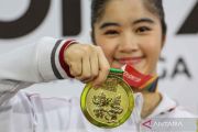 Pesenam DKI Jakarta Kriscahyani Kurniawan menggigit medalinya saat upacara penganugerahan medali pada final senam aerobik perorangan putri PON XXI Aceh-Sumut di Gedung Serbaguna Dispora Sumatera Utara, Deli Serdang, Sabtu (7/9/2024). Krischayani Kurniawan meraih medali emas dengan nilai 18,650, medali perak diraih pesenam Jawa Timur Della Rose Ananda Purbowo dengan nilai 18,450 dan pesenam DI Yogyakarta Elmalia Virdania Putri mendapatkan medali perunggu dengan nilai 17,800. ANTARA FOTO/Makna Zaezar/YU