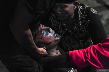 Pawang (atas) menenangkan salah seorang anggota Paguyuban Seni Budaya Suko Laras Kendali Bendung Sejati (SLKBS) yang kesurupan saat memainkan tari Kuda Lumping di permukiman transmigran Desa Tanjung Benanak, Tanjung Jabung Barat, Jambi, Senin (9/9/2024). Desa Tanjung Benanak yang merupakan salah satu desa transmigrasi yang dibuka pada tahun 90-an di kabupaten itu memiliki beberapa sanggar seni yang pendiriannya diinisiasi oleh beberapa keluarga transmigran setempat untuk mengenalkan seni tradisi leluhur mereka di daerah asal kepada anak-anak yang lahir dan besar di Jambi. ANTARA FOTO/Wahdi Septiawan/foc.