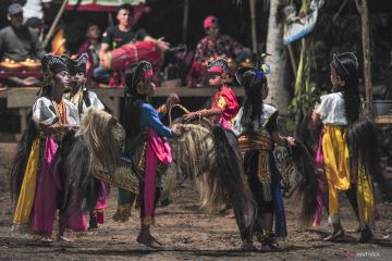 Anggota Paguyuban Seni Budaya Suko Laras Kendali Bendung Sejati (SLKBS) memainkan tari Kuda Lumping di permukiman transmigran Desa Tanjung Benanak, Tanjung Jabung Barat, Jambi, Minggu (8/9/2024). Desa Tanjung Benanak yang merupakan salah satu desa transmigrasi yang dibuka pada tahun 90-an di kabupaten itu memiliki beberapa sanggar seni yang pendiriannya diinisiasi oleh beberapa keluarga transmigran setempat untuk mengenalkan seni tradisi leluhur mereka di daerah asal kepada anak-anak yang lahir dan besar di Jambi. ANTARA FOTO/Wahdi Septiawan/foc.