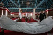 Abdi dalem Keraton Kasunanan Surakarta menaruh gamelan Sekaten Kyai Guntur Madu dan Kyai Guntur Sari di Bangsal Pradangga Masjid Agung, Solo, Jawa Tengah, Senin (9/9/2024). Kedua gamelan pusaka Keraton tersebut akan ditabuh selama tujuh hari berturut-turut sebagai tanda dimulainya tradisi Sekaten atau peringatan Maulid Nabi Muhammad SAW dalam sejarah penyebaran agama Islam di Pulau Jawa oleh Wali Songo. ANTARA FOTO/Mohammad Ayudha/foc.