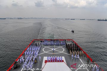 Sejumlah prajurit TNI Angkatan Laut mengikuti upacara peringatan HUT Ke-79 TNI Angkatan Laut di KRI dr. Radjiman Wedyodiningrat-992, Perairan Teluk Jakarta, Selasa (10/9/2024). Peringatan HUT Ke-79 TNI AL tersebut mengambil tema "Dengan Semangat Jalesveva Jayamahe TNI AL Siap Mewujudkan Nusantara Baru Indonesia Maju". ANTARA FOTO/Muhammad Adimaja/Spt.