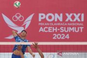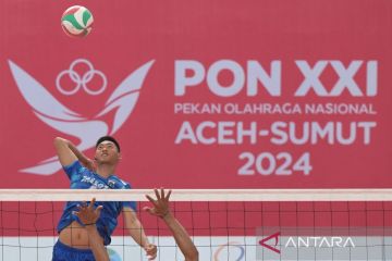 Pebola voli DKI Jakarta Dio Sapto bersiap melakukan smes saat melawan tim voli Sulteng pada pertandingan fase grup bola voli putra PON XXI Aceh-Sumut 2024 di GOR Bola Voli Indoor Sumut Sport Center, Deli Serdang, Sumatera Utara, Rabu (11/9/2024). DKI Jakarta menang atas Sulteng dengan skor 25-16, 25-15, 25-16. ANTARA FOTO/Fauzan/tom.